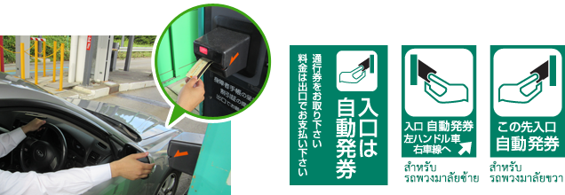 2. ที่ด่านเก็บเงินขาเข้า หยิบบัตรผ่านทางจากเครื่องจ่ายตั๋วอัตโนมัติ 3. ในบัตรจะระบุประเภทของรถยนต์ ชื่อด่านทางด่วน วันและเวลาที่ออกบัตร และรายละเอียดอื่นๆ (* ด่านเก็บเงินขาเข้าบางแห่ง รับชำระเงินล่วงหน้า)