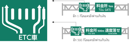 ป้ายบอกทางเพื่อชี้ช่องทางเข้าสำหรับผู้ใช้บัตร ETC ติดตั้งในจุดที่ใกล้ถึงด่านขาออก เมื่อใกล้ถึงด่าน ให้มองหาป้ายดังกล่าวและเข้าช่อง ETC